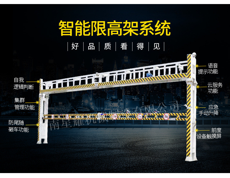• 自我邏輯判斷:當車輛緩行沒有按規定時間通過,限高架自動 識別不再下降, 車輛通行完畢后可自動回位到設定高度 ;